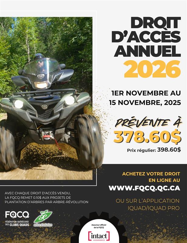 bonjour a tout les membres du club quad du haut saint-françois le sentier secteur 8em avenue et route 112 seras fermer du 2 juin au 6 juin pour des travaux installation de fils électrique sous -terrain , merci de votre compréhension